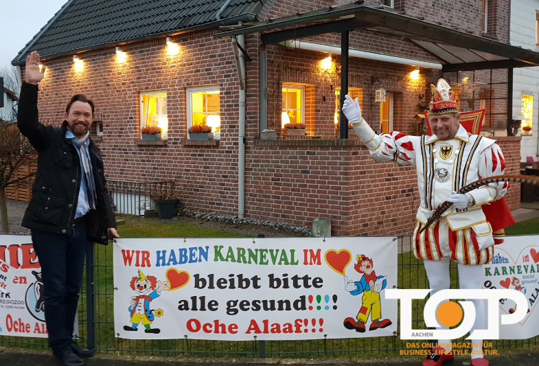 Als Zeichen der Wertschätzung besuchte Prinz Guido I. jetzt den Ideengeber der Aktion „Wir haben Karneval im Herzen“ – mit seiner Prinzennadel und eine Spende in Höhe von närrischen 222,00 Euro von ihm und seinem Hofstaat im Gepäck. Auf Abstand konnte draußen ein Erinnerungsfoto mit dem Banner gemacht werden. Die Prinzengarde der Stadt Aachen unterstützt die Spendenaktion ebenfalls mit 222,00 Euro.