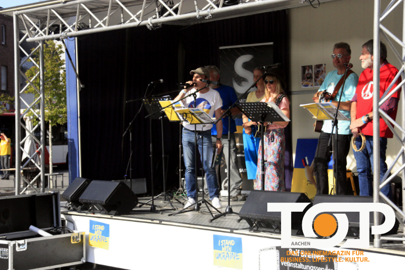 Neben dem Brander Stier pulsierte jetzt endlich wieder das Leben. Denn zahlreiche Besucher machten sich auf den Weg zum Benefiz-Festival „Hand in Hand mit der Ukraine, das Veranstalter Andreas Rüben & Friends mit Künstlern und Künstlerinnen und feinster Live-Musik darboten. Georg, Holger, Andreas und Toni, besser bekannt als Schlagsaiten-Quantett, versetzten die Besucher mit ihrem unglaublichen Sound in eine großartige Stimmung. Fantastisch auch der Künstler Rick Takvorian, der mit Schlagsaiten-Quantett auf seiner Gitarre spielte und dazu sang. Sohn Nick Takvorian sprang buchstäblich in letzter Minute für die erkrankte Nicole Malangré und ihrem Duettpartner ein. Nach Nicks melodischen Kompositionen aus seiner CD „A Quiet Storm“ folgte ein Special im Vater – Sohn- Duett zu „Lokomotive Breath“. Mit ihrer atemberaubenden klaren Stimme verzauberte Lea Ludwig alias CLEAR-LY an ihrer Ukulele. AIXANDI, der auch die Rolle des Veranstalters und Moderator des Abends verkörperte, setzte mit Eigenkompositionen an der Gitarre später im Duett mit Clear LY als Sing/ Songwriter seine eigene Note. Die weiteste Anreise hatten Peter, Paul & Harry, Mary & Cherrie, aus Neuss. Sie eroberten die Besucher mit Können und den charmanten Darbietungen. Fazit: 7.700 Euro konnten durch Sammelbüchsen, Hilfe von Sponsoren, dem gestifteten Bild und zehn limitierten Postkarten des Künstlers Prof. Stefan Kaußen, sowie Spenden gesammelt werden. Das Geld wird in Absprache mit der Pfarre St Donatus nach Prüfung nur für die hier in der Region lebenden Flüchtlinge aus der Ukraine eingesetzt.