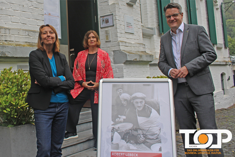 Die Leiterin des KuK Monschau, Dr. Nina Mina-Helfmeier (l.) hat jetzt gemeinsam mit der Witwe des Künstlers, Cordula Lebeck, Städteregionsrat Dr. Tim Grüttemeier durch die Ausstellung „Portraits von Ländern und Menschen“ mit 130 Werken des Fotografen Robert Lebeck geführt.