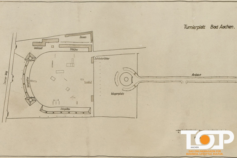 - zeigt eine Planzeichnung des Turnierplatzes in der Aachener Soers für das erste überregionale Reit-, Spring- und Fahrturnier des Aachen-Laurensberger Rennvereins 1925.