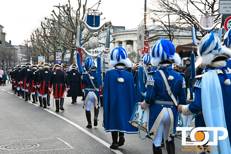 Am 8. Februar 2025 erlebten die Öcher Jecken die 7. Öcher Fastelovvendsparade. Rund 500 Uniformierte, darunter 200 Musikerinnen und Musiker mit Pauken und Trompeten, boten ein imposantes und buntes Spektakel in der Aachener Innenstadt.