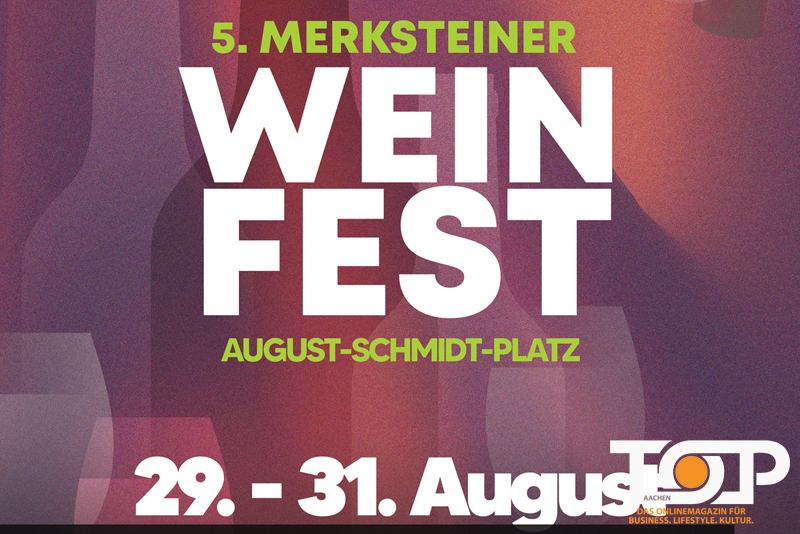 Der Stadtmarketing Herzogenrath e.V. veranstaltet in Merkstein auf dem August-Schmidt-Platz bereits zum fünften Mal ein großes Weinfest. Das beliebte Event findet in diesem Jahr vom 29. bis 31. August statt. Freitags und samstags ist das Weinfest für Besucherinnen und Besucher von 16 bis 24 Uhr geöffnet, am Sonntag kann man von 11 bis 19 Uhr nach Herzenslust schlemmen und Wein verkosten. Insgesamt vier verschiedene Winzer haben sich in diesem Jahr mit ihren Weinen angekündigt. Zum Wein gibt es eine große Auswahl an Flammkuchen sowie diverse zum Wein passende Leckereien. Zudem werden Pasta im Parmesanlaib; Kartoffeldrillinge mit Trüffelmayonnaise und Parmesan, Reibekuchen und Crêpes sowie Bubble Waffeln angeboten. Auch klassische Imbisswagen und eine Auswahl an Bier, alkoholfreien Getränken und coolen Sommer-Drinks wie Aperol sind am Start.